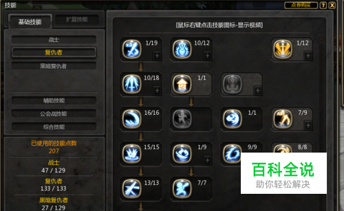 第三技能页面黑暗复仇者,技能点主要考虑自己想不想堆最终属性,如果你是平民玩家,就不必要考虑了,如图加点,否则EX加强技能点前面的就好了
