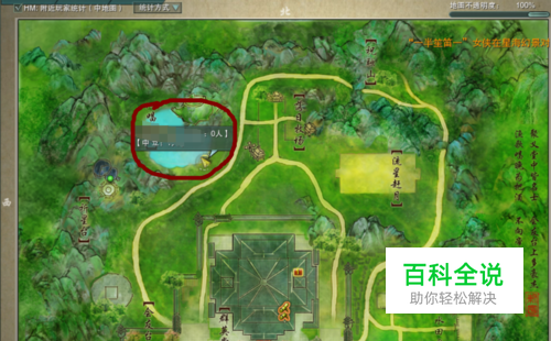 在主城找到帮会家园执事,传送回帮会领地。到唱晚池旁,看到钓鱼商李霖。