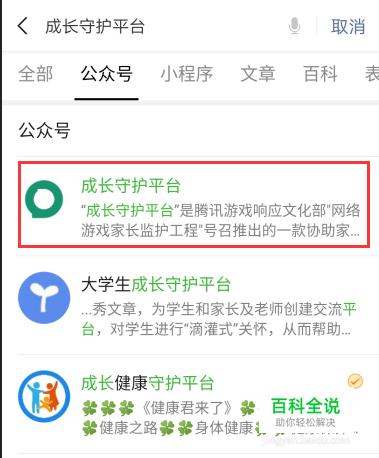 在搜索栏中输入“成长守护平台”,然后点击第一个“成长守护平台”。