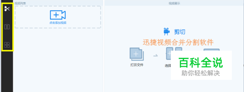 第一步,需要一个视频合并工具,打开这样一个集视频分割和合并的软件,左侧的第一个是分割功能,第二个就是合并功能;