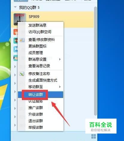 登录你的QQ,找到你要转让的QQ群,鼠标移到该群,然后鼠标点右键,找到“转让该群”然后点击。