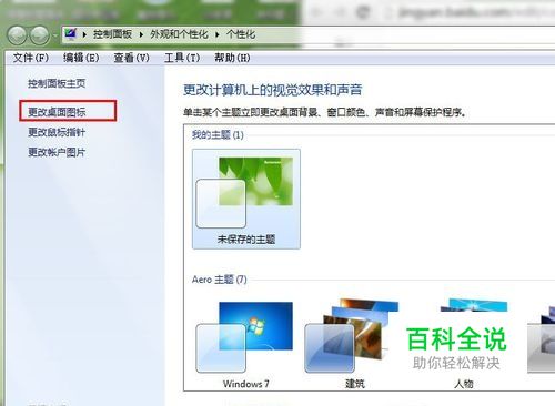 打开控制面板——个性化窗口,点击左边的更改桌面图标。