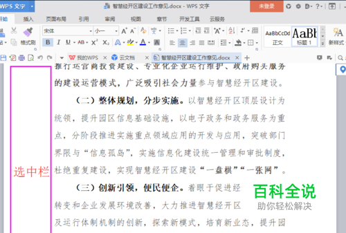 【选中栏】就是WPS文字Word文档左侧的空白区域。当鼠标指针移至该空白区域时,便会呈现【向右倾斜的鼠标指针】。