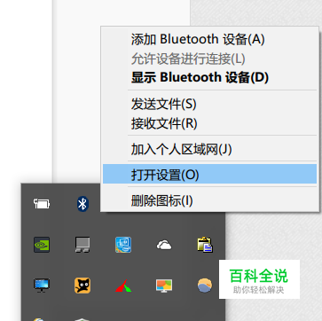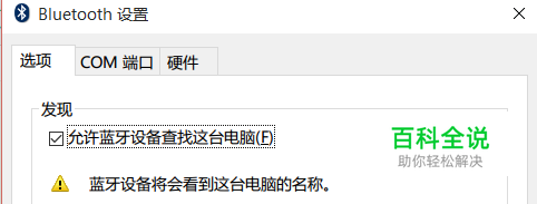 右键单击屏幕右下角托盘区的蓝牙图标,在弹出的对话框中选中“允许蓝牙设备查找这台电脑”,再点击确定。