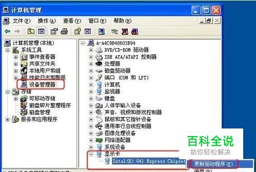 在计算机管理栏里,点击左边框(设备管理器),在右边框的下方选择显示卡,鼠标右击显示卡项,选择(更新驱动程序)。