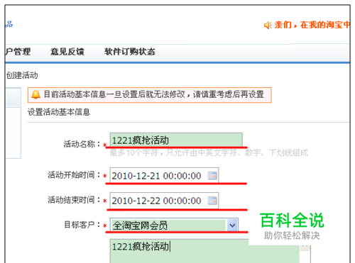 在系统弹出的提示框中,选择“确定”。 再次提示,一旦提交后,活动名称与时间就不能修改了哦,如果真的填错了,可以选择重新创建一个活动,重新设置。 下面给大家介绍如何设置参加活动的宝贝。