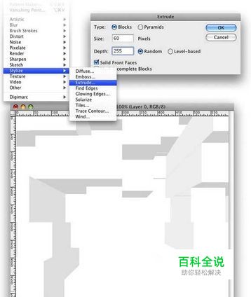 1.建立一个新文档,这里我用600*600像素。建立一个新图层并用白色填充,命名为“Blocks”。然后执行滤镜-风格化-凸出,设置如下所示: