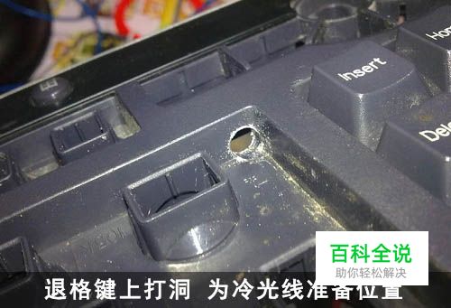 打孔非常重要,需要提前设计好冷管线的进入位置,这个位置因键盘的模块不同而不同,你也可以只在字母键位置安装,总之要提前想好。同时钻孔的口径要注意,不要太大,以能穿过冷光线为准。