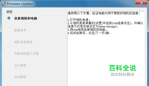 注意:升级时切勿关闭相机电源或者中断USB连接。