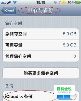 ⒈)首先在我们的iPhone手机中找到“iCloud存储于备份”应用,然后打开“iCloud云备份”选项如下图: