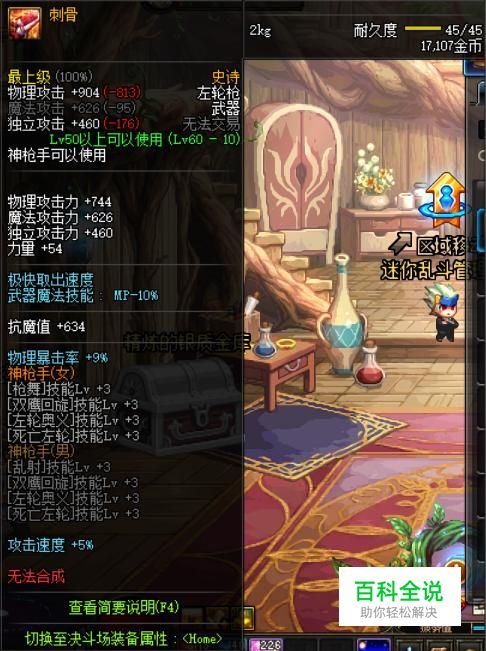 武器:60级SS左轮枪“刺骨”,装备附加效果中包含女漫游枪手的BUFF技能【死亡左轮】技能等级+3。