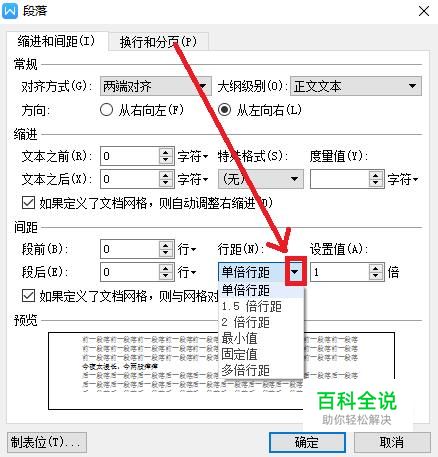 点击行距下方的“▼”选项,可以选择行间距为几倍行距或者固定数值行距,并在后面输入行距倍数或固定的行距数值,点击确定即可完成对行间距的设置。