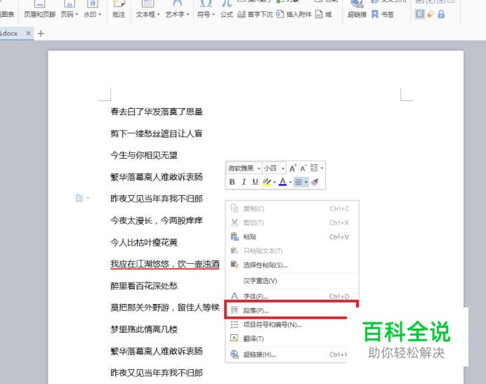 首先,打开WPS文字,在文档中单击鼠标右键,在弹出的菜单栏中,点击“段落”选项。