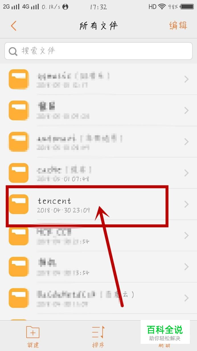 在“所有文件”页面,找到“tencent”文件夹,点击并进入,如图所示。
