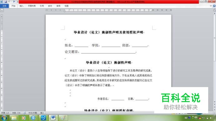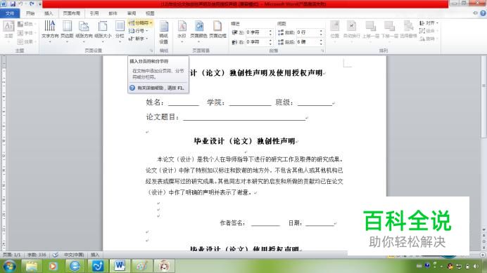 将光标放到“保密的论文(设计)在解密后遵守此规定。”的后面,按下enter键,便插入了一个下一页分节符,效果如下
