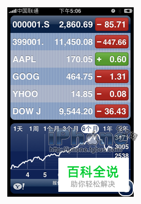 将iPhone的屏幕横向旋转就可以横向查看图表,此时,左右划动手指可以切换股票的列表。点击触摸图表,可以显示某个特定时间点的报价,将手指沿图表拖移,还可以查看实时的价格。