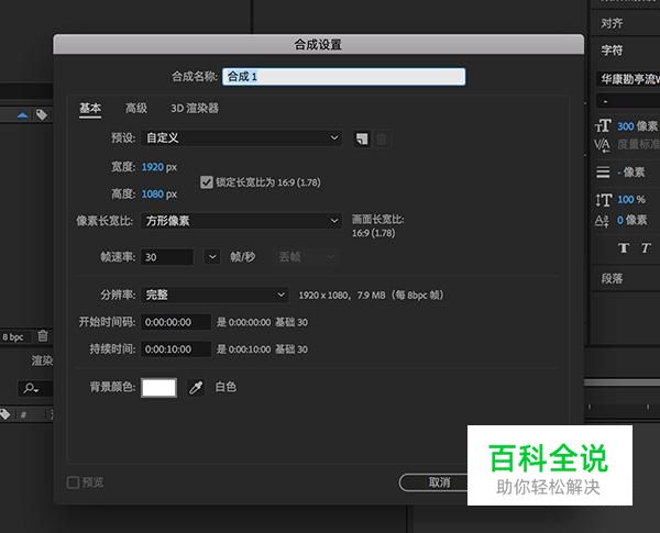 进入电脑中的AE软件,CTRL+N创建新和成,帧速率为30,不要太高。