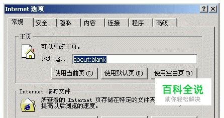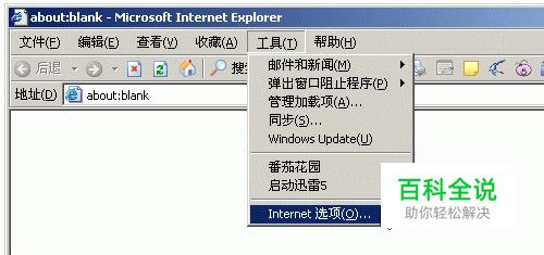 步骤一:打开IE,选择菜单栏中“工具-Internet选项”,选中后弹出“Internet选项”对话框。