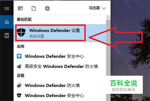 然后在搜索栏输入“windows defender”,再按下回车搜索,点击上方的第一个搜索结果。