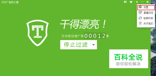 打开天行广告防火墙软件,在主界面,点击右上方【功能菜单】选项中的“设置”。如图: