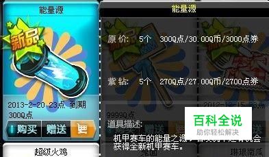 能量源可以通过购买获得: 原价:5个300Q点/30.00Q币/3000点券 紫钻:5个270Q点/27.00Q币/2700点券