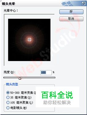 2.选择”滤镜”— ”渲染”— ”镜头光晕”,其设置如下所示。