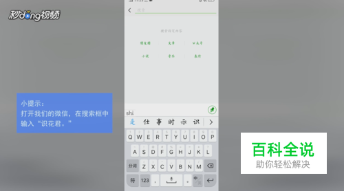 首先打开微信,在搜索框中输入“识花君”,“识花君”是微信自带的一个小程序,如果搜索没有这个程序,可以更新一下微信版本