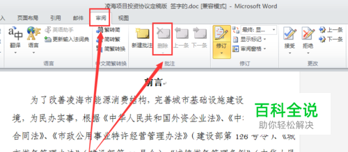 我们找到“审阅”按钮,点击它就找到了审阅的功能区菜单。然后找到“删除”按钮,如下图所示,提示的按钮操作即可。