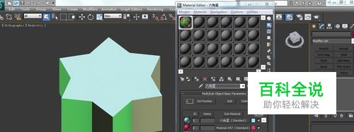 四:将所有的面按自己的想法都设置好id号后,打开材质编辑器,随意选择一材质球,按自己想法命名为六角星,记得一定要养成先给材质球命名的好习惯,将材质球赋予场景中物体显示出来,默认的材质颜色是灰色。