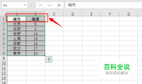 我们需要准备这样一份数据,数据要有表头,其中要有一列是对应的数据,之后,我们选中这组数据(包含表头)。