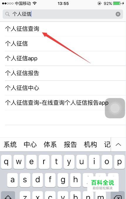 进入搜索功能之后,在输入框输入“个人征信”,然后选择第一条“个人征信查询”,如图所示。