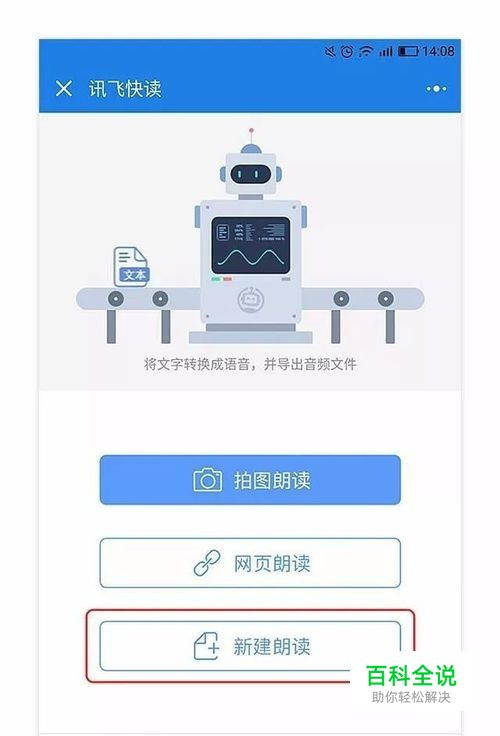 在微信-发现-搜索小程序:讯飞快读,会进入这个页面,然后你可以选择拍图朗读,或者网页朗读,或者直接点【新建朗读】输入文字: