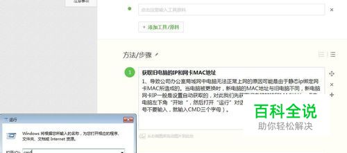 获取旧电脑的IP和网卡MAC地址 1、导致公司办公室局域网中电脑无法正常上网的原因可能是由于静态ip绑定网卡MAC所造成的。当电脑被更换时,新电脑的MAC地址与旧电脑不同,新电脑网卡IP一般是设置自动获取的,对此我们先获取旧电脑的IP和MAC地址:点击电脑左下角“开始“,然后打开“运行”对话框,在运行中输入”cmd“(引号不要输入,就输入CMD三个字母)。点击”确定“打开的MSDOS界面。