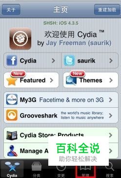 点击桌面上的的Cydia图标,运行Cydia程序,并选择下面的“管理”:
