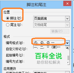 在脚注尾注选项卡里,选择添加“脚注”(在脚注前点击,黑点出现在圆圈中即可),然后点击格式右侧向下的小箭头,选择脚注的格式,我选择了①②③的类型。然后点击“插入”,脚注就出现在了下方。