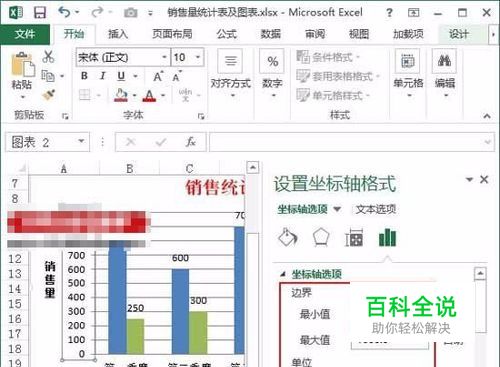 此时会打开“设置坐标轴格式”窗格,并且自动打开了“坐标轴选项”,大家根据自己的需要调整“边界”和“单位”区域中的值,最小值表示刻度的起始值,最大值表示刻度的终止值,单位中修改主要值就好,它表示的是刻度的间隔。