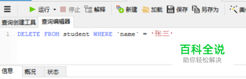 查询张三 SELECT * FROM student WHERE `name` = '张三' 删除学生张三 DELETE FROM student WHERE `name` = '张三'