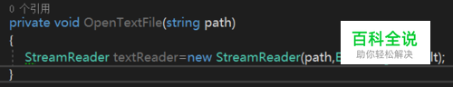 使用C#来读取文件,需要引用System.IO命名空间。 首先我们实例化一个StreamReader对象,添加两个参数,由于我是新建了一个方法写的,所以我的文件路径参数是变量,后面那个Encoding是个表示文档编码格式的类。