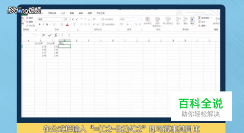 点击同比下方单元格,在公示栏输入“=(C2-B2)/C2”即可算出其同比。
