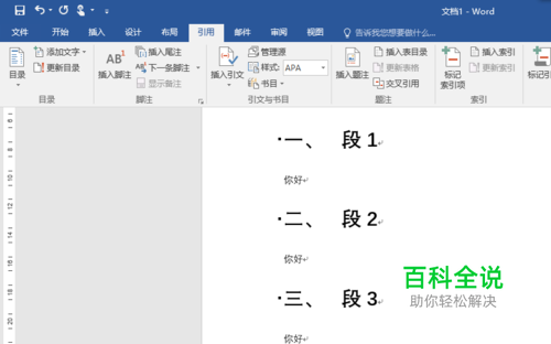如下图参考,在第一章大目录下,还有1.1 1.2等二层目录,这里需要增加一些操作,选中1.1,还是引用---添加文字--选择2级