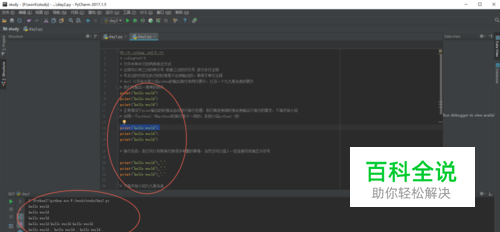 换行 正常情况下print输出的时候会自动进行换行处理,我们肯定有时候会有输出不换行的需求,下面开始介绍如何不换行输出: 例子: print("hello world"), 在python2.7下只要在print的()外加一个,就可以实现不换行,在python3下是 ,end=“”来解释。,本经验介绍的是2.7环境下的例子。