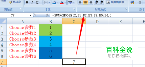 当然,CHOOSE的参数还可以为单元格区域,例如将B列分成三组,计算第二组单元格区域之和,则使用公式“=SUM(CHOOSE(2,B1:B2,B3:B4,B5:B6))”。