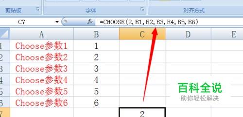下面来看一下具体的使用方法: 制作如图所示的表格,当我们使用公式“=CHOOSE(2,B1,B2,B3,B4,B5,B6)”时,结果将返回B2单元格内容即“2”。