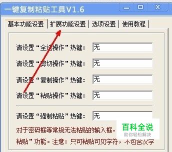 首先我们要对软件进行设置,在系统自带的复制粘贴操作中,我们是靠鼠标的左右键的配合来做到,或者根据键盘上的快捷键,但是我们为了达到更快速高效的目的,需要选择键盘上的某个按键来当作快捷键。如图,我们点击扩展功能设置。