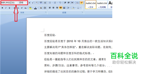 1、打开Word,输入需要输入的文字,输好后,全部选中,首先进行文字的字体,大小设置,一般办公选用宋体,正文四号字比较多,字体设置在工具栏中可以找到,也可以单击右键,找到字体。