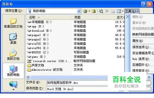 第一种:windows自带的加密方法,适合给单个word加密,不利于给多个word加密。 1.首先打开你需要加密的word文件,打开“文件”→“另存为”→点击“工具”按钮中的“安全措施选项”。(如图)2..在弹出的密码栏中输入密码,确认输入后即可。(如图)