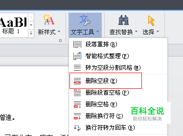 点击文字工具,会出现一个下拉菜单,找到“删除空段”,则整篇文档的空段都会被删除。