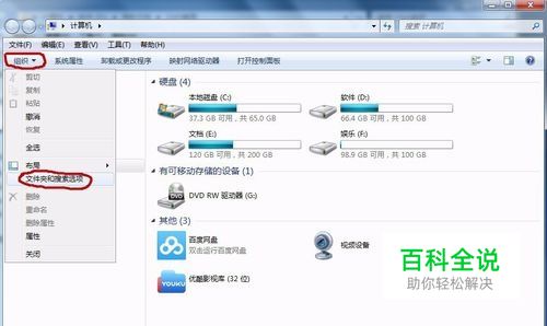 点击“组织”,选择“文件夹和搜索选项”