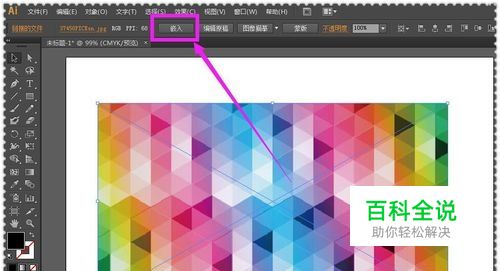 首先需要在电脑上下载安装一个AI软件,打开安装好的AI软件,将任意一张自己喜欢的图片直接拖到软件里面。拖图片进去之后,再点击图片上方工具栏里面的”嵌入“按钮,确定图片的嵌入使用。