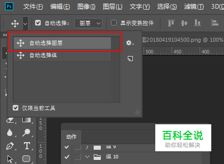 之后开始录制动作,打开工具预设,点击“自动选择图层”(这一步很关键),然后点击动作下面的小方块按钮结束录制